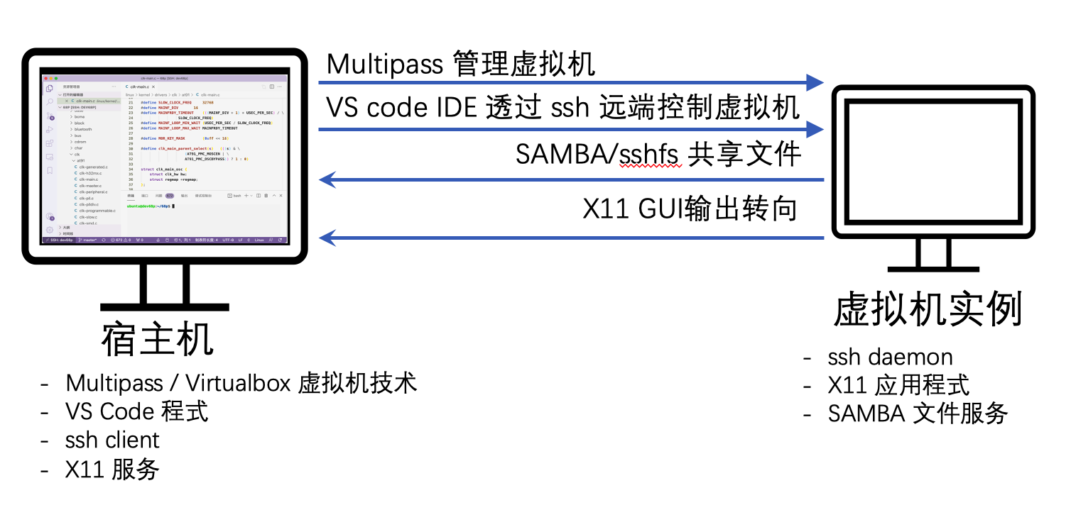 HyperKit/Hyper-V 等轻量虚拟化技术使用系统资源较低,但并未模拟整机。在嵌入式开发的场景下,会需要透过USB或其他周边来完成烧录、仿真等工作,此时我们会需要透过宿主机的工具来运行。利用scp、sshfs、或SAMBA 文件服务可以将文件复制,或将文件系统共享给宿主机来完成这些硬件需求的工作。