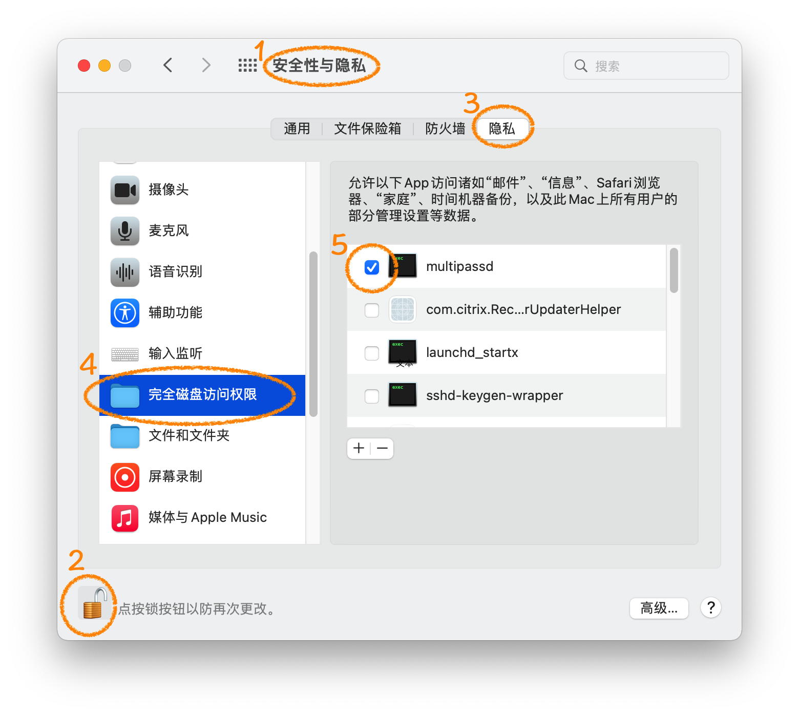 打开 设定app --> 安全性与隐私 --> 隐私页 --> 左下角解锁 --> 4. 完全磁盘访问权限 --> 勾选允许 multipassd,参考下图: